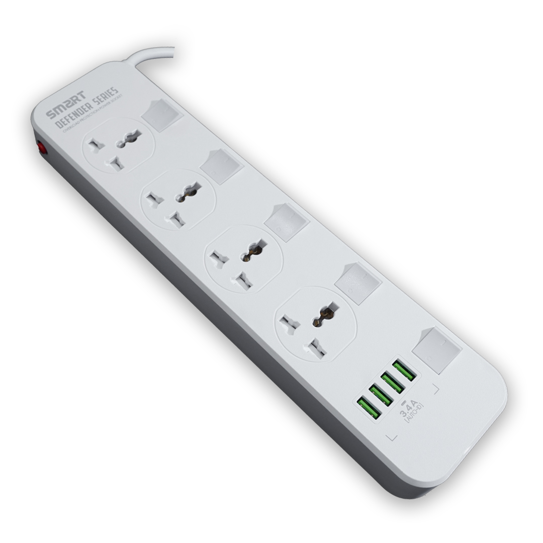 The SMART SEE-PE44L power socket is a versatile and reliable solution for powering and charging your devices. Designed for both safety and convenience, this universal power strip features 4 AC outlets and 4 USB ports with a total power output of 17W, ideal for charging multiple devices simultaneously. Equipped with an independent switch, overload protection, and a heavy-duty 2-meter power cord, the SEE-PE44L ensures optimal performance and safety for all your household appliances and gadgets. Its sleek 15° slope design makes it easy to plug and unplug devices, while compatibility with various plug types (US/EU/UK) makes it suitable for global use.